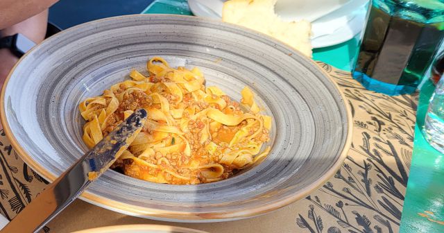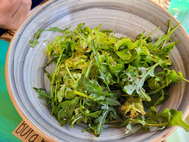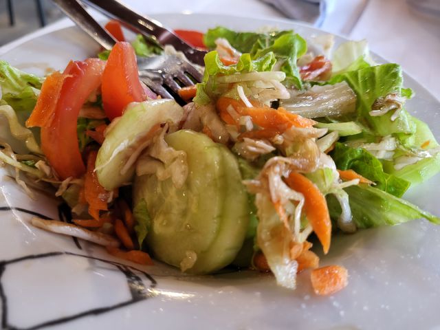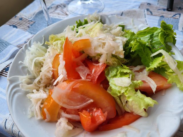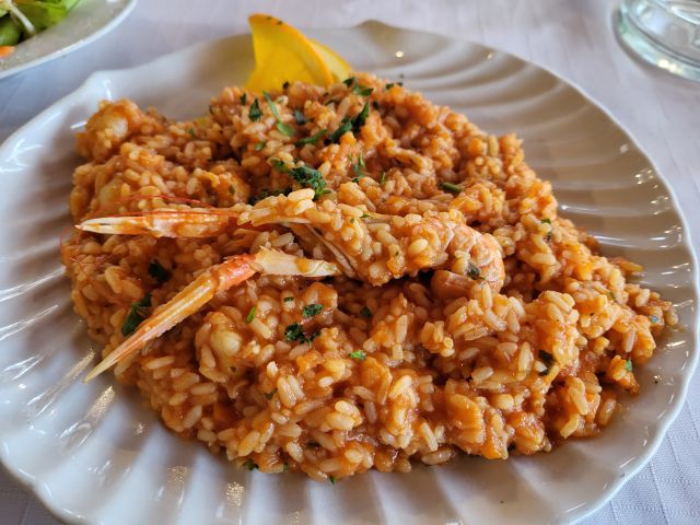 Včeraj kosilo v restavraciji tik ob morju- jaz rižoto s škampi, mož polnjen zrezek s prilogami, oba solato.
