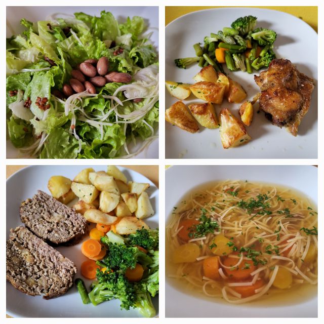 Danes vsi na kosilu- goveja juha z rezanci, mesna pečenka, pečeno bedro brez kosti, pečen krompir, zelenjava, mešana solata s fižolom