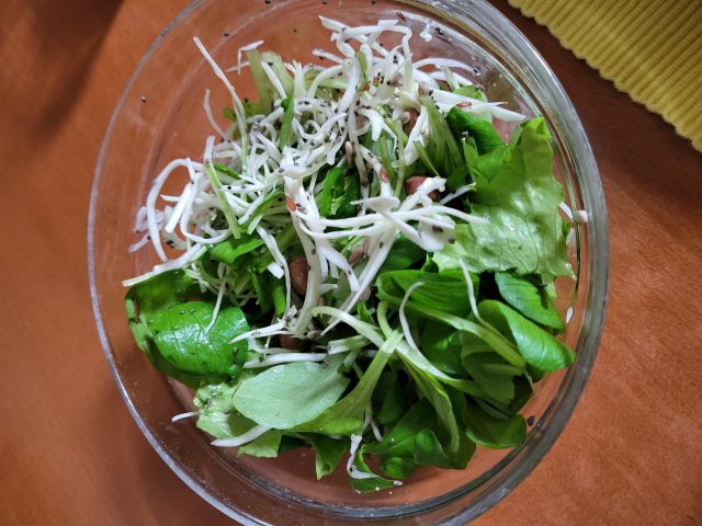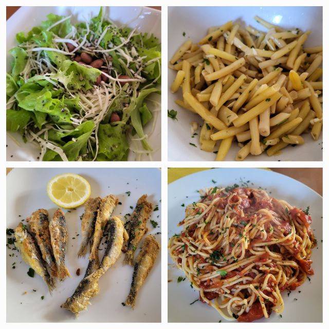 Danes špageti z paradižnikovo omako z dodanimi pikantnimi začimbami iz Sicilije, zame sardelice, solati