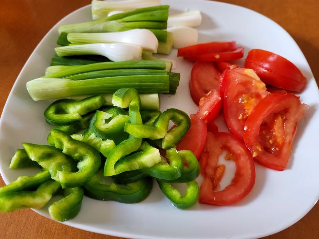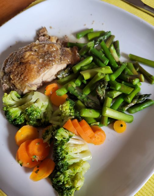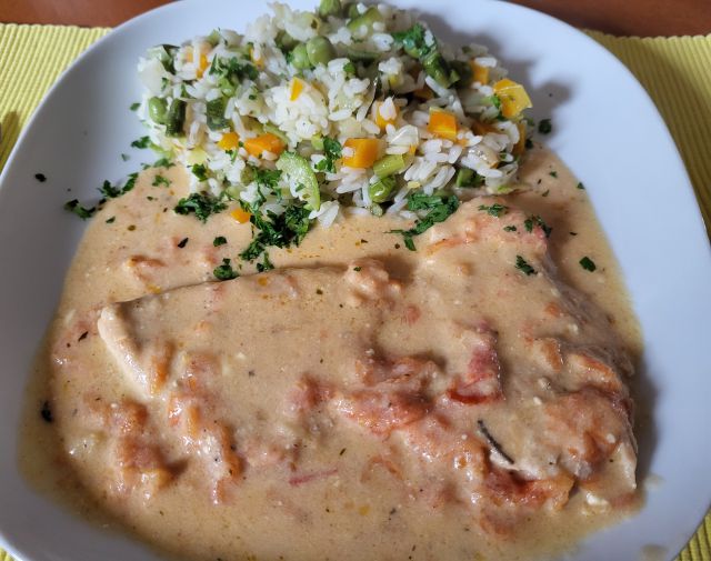 Včeraj zame kos piščanca z zelenjavo, za moja dva zrezki v omaki, zelenjavni riž, solata