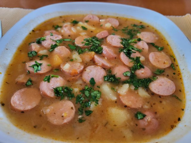 Danes krompirjev golaž s hrenovko, zelenjava, kruh