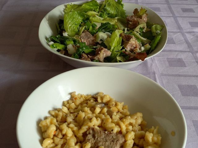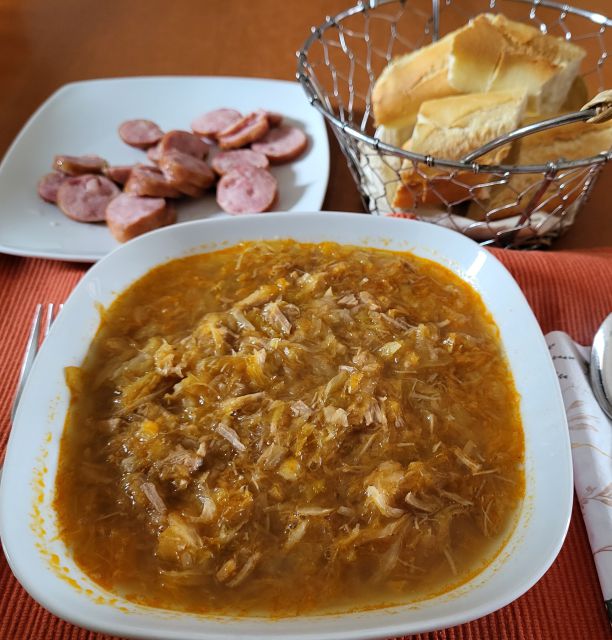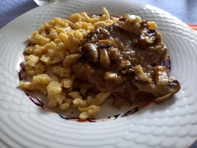 Goveja juhica, vratovina s šampinjoni v vinski omaki, špecli; zelena solata z zeljem, bagete, srnin hrbet; kavica