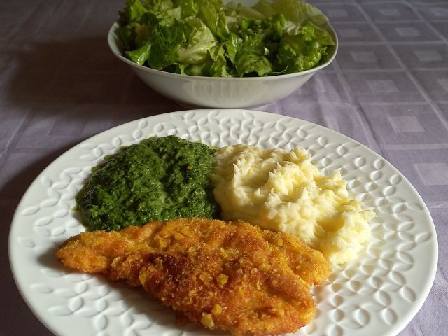 Špinača, pire krompir, pišč. zrezek po dunajsko; zelena solata