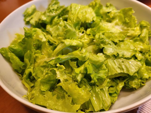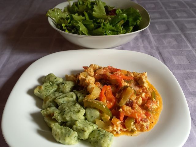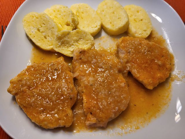 Danes zrezki v omaki, skutina klobasa, zelena solata