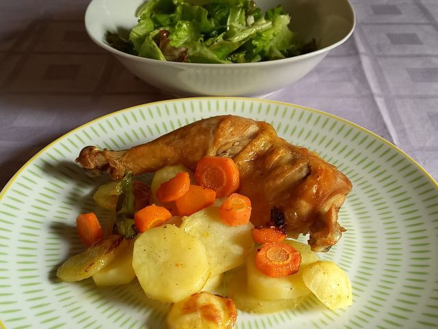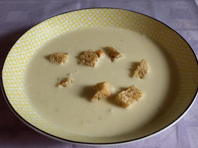 Ohrovtova kremba juhica s popečenimi krutoni; pečeno piščančje bedro s krompirjem; berivka