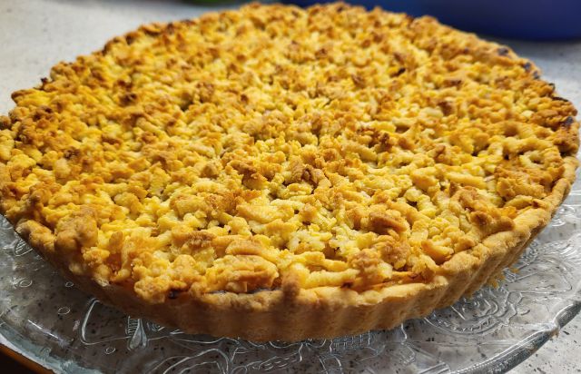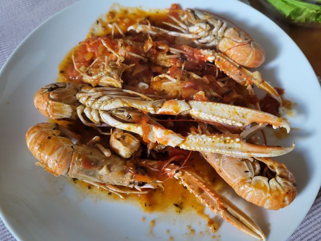 Danes je sin jedel na poti, jaz škampe buzara, zelena solato. Mož za pozno kosilo govejo juho z rezanci, pol hrenovke, paradižnik, kruh. Za sladico jabolčna pita.