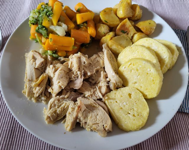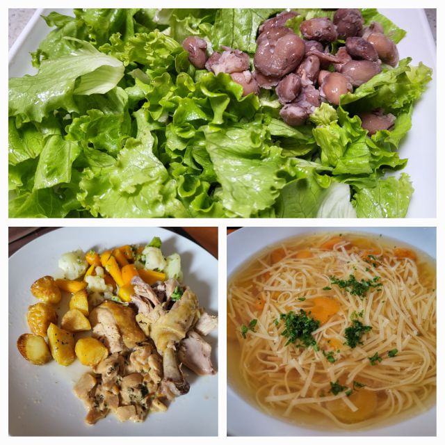 V nedeljo na obisku hči z družino, goveja juha z rezanci, mlad pečen krompir, svinjski kareji, piščančje meso, zelenjava, zelena solata s fižolom, jabolčna pita... ( določene slike kosila manjkajo)
