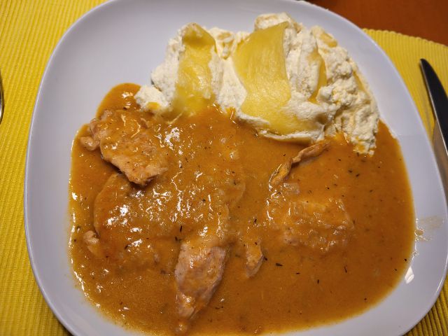 Danes zrezki v omaki, skutni štruklji (razpadli), solata