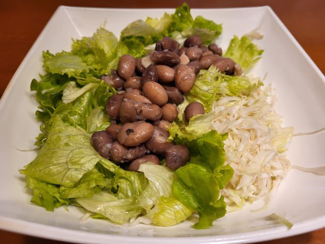 Krompirjeva musaka z mesom, kumarice, paradižnik in stročji fižol v solati, kavni kolač z orehi in čokolado, kava