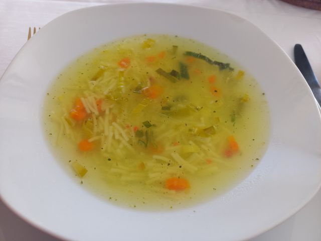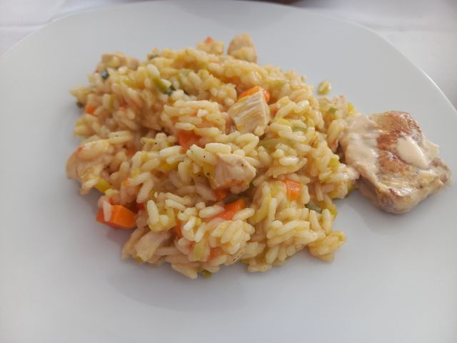 Zelenjavna juhica; piščančja rižota; zelena solata