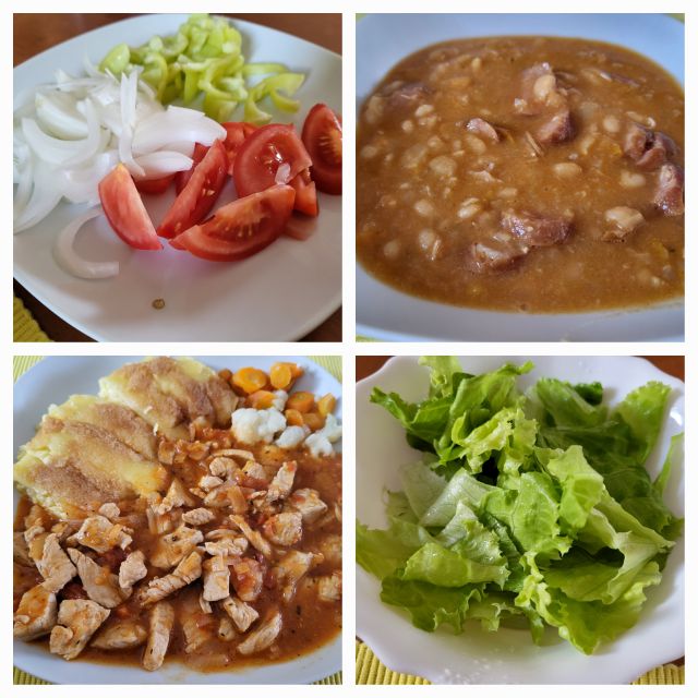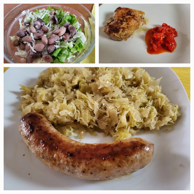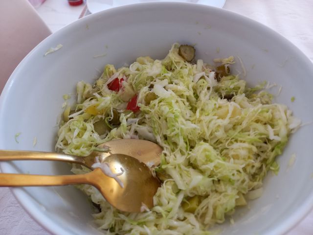 V sredo sva bila sama, jaz kos piščanca, solato, mož praženo kislo zelje, pečenico, kruh