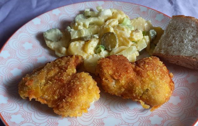 Panirane perutničke, krompirjeva solata; grozdje in nektarine