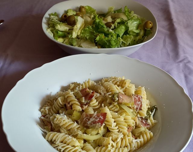 Svedrčki v omaki - slanina, česen, pesto genoveze, parmezan; zelena solata, zelje, mlada čebula, olive, avokado