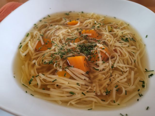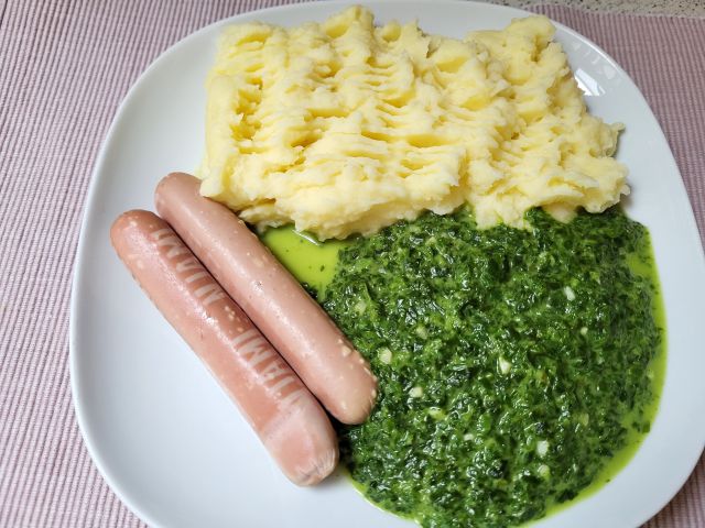 Včeraj goveja juha z rezanci, špinača, hrenovke