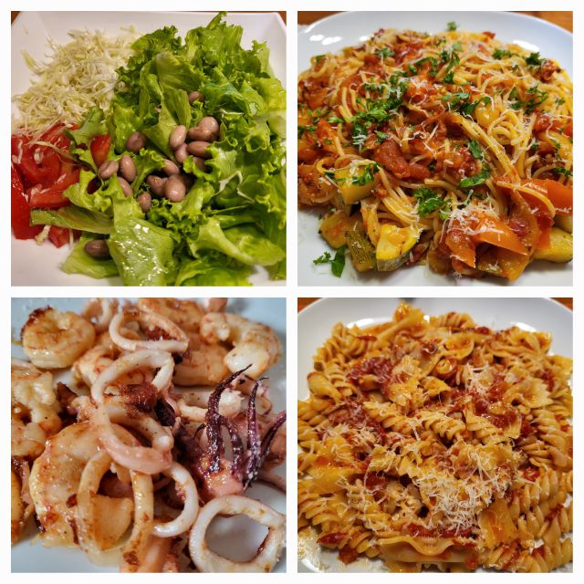 Danes zame jadranski ligenj, kozice, mešana solata. Za moja dva - eden špageti z domačo zelenjavno omako, drugi makarončki s paradižnikovo omako - domačo, mešana solata.