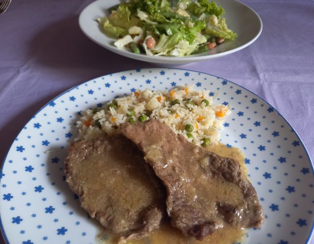 Goveji zrezki v naravni omaki, rizi-bizi; mešana solata