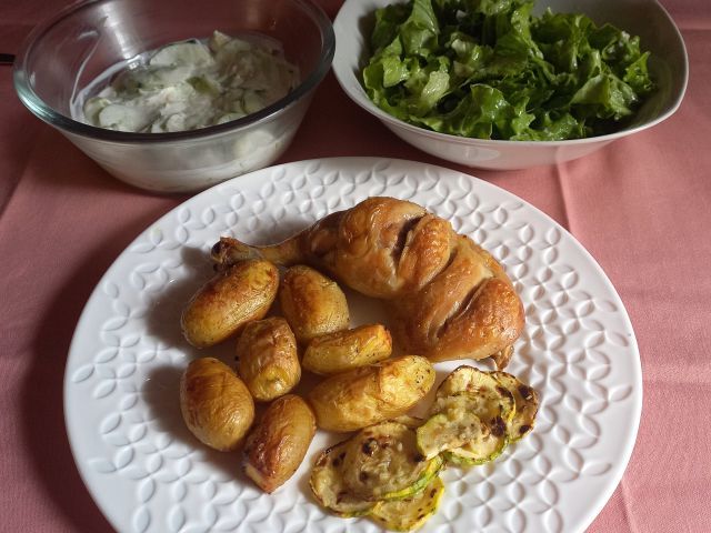 Pečeno bedro, kifeljčar, popečene bučke s česnom; zelena solata, kumarice z jogurtom