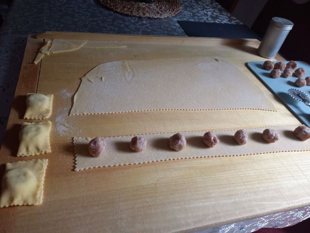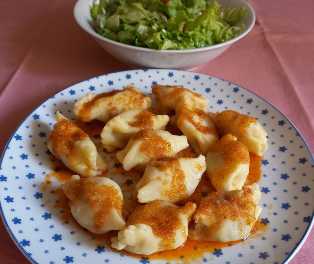 Bučna juhica s popečenimi semeni; nekje bi rekli žlikrofi, nekje klepe... Skratka, testo nadevano z mesno kroglico; mešana solata