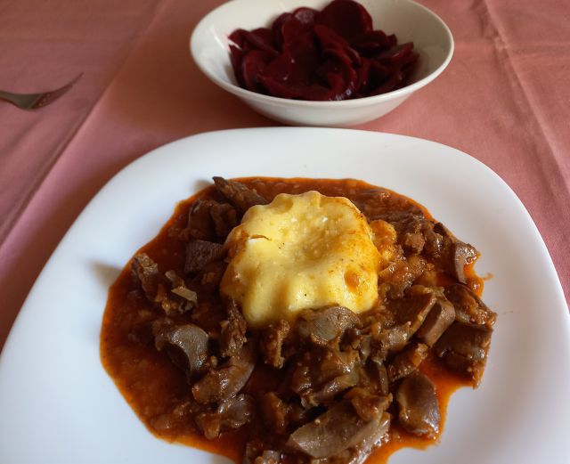Želodčki in jetrca v omaki, polenta s feta sirom; rdeča pesa