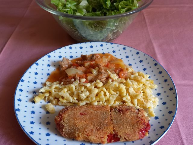Sataraš, špecli, panirana polnjena paprika; zelena solata