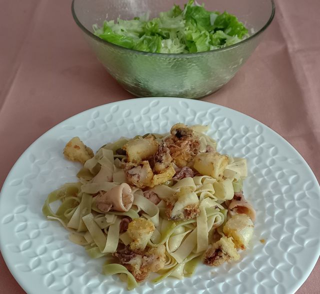 Široki rezanci s kalamari, zelena solata; kuhana koruza