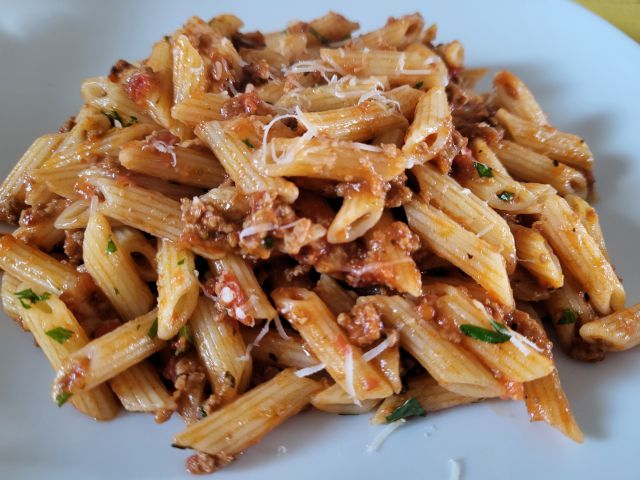 Sončnice (girasoli) z baziliko in pinjolami v paradižnikovo-paprični omaki in grana padano