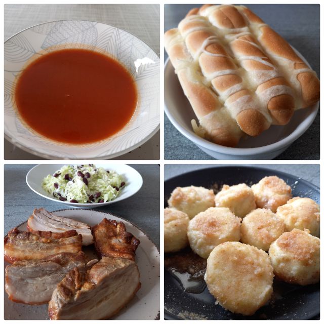 Paradižnikova juhica z rižem; pečena sv. rebrca, zeljnata solata s fižolom; slivovi cmoki s skutnim testom