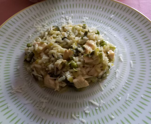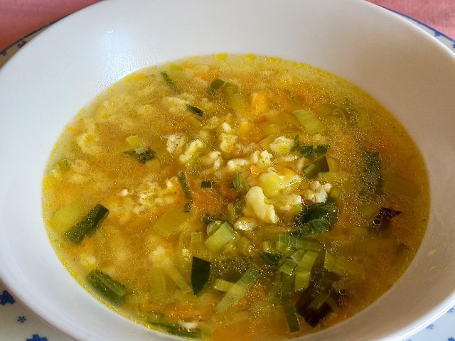 Porovo-korenčkova juhica; piščančja rižota; mešana solata (testo za jabolčni štrudelj počiva)