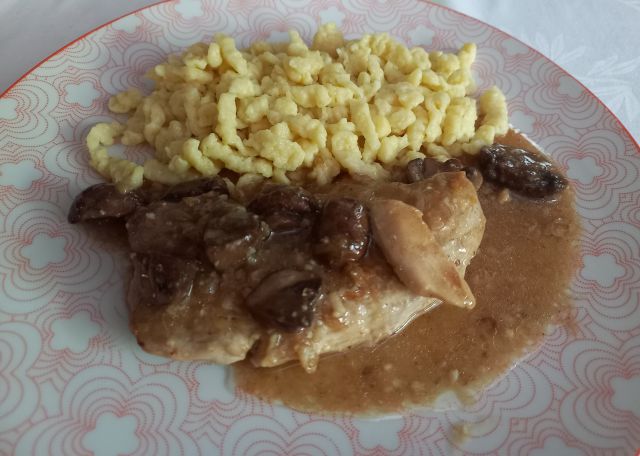 Sv. in pišč. zrezki s šampinjoni, špecli; mešana solata