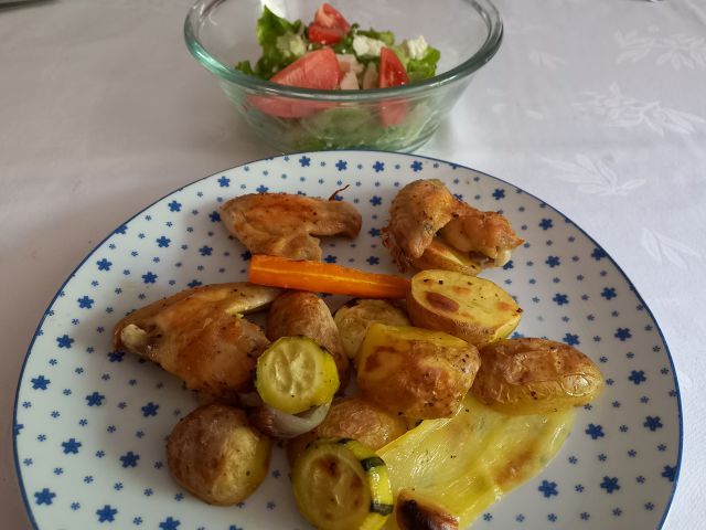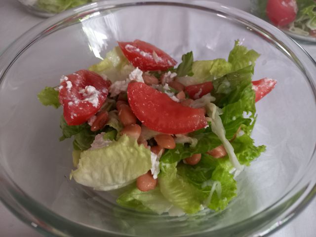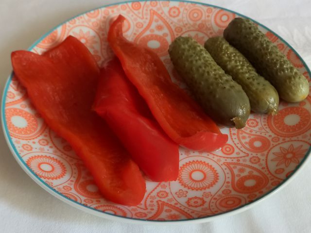 , kunčjim , telečjim mesom. Kuhana zelenjava, rdeča pesa v solati, lahko tudi malo mladega stročjega fižola, star