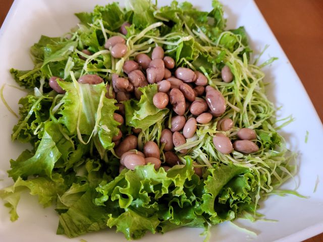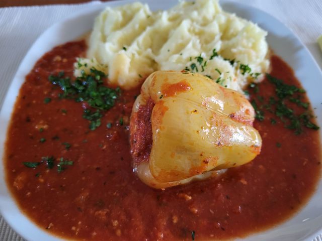 Danes filane paprike, pire krompir, zelena solata, zeljna s fižolom. Letos spet domače paprike, solata, zelje.
