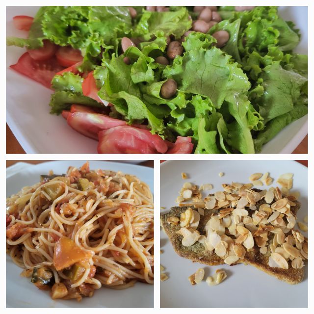 Včeraj za moja dva špageti z zelenjavno omako, zame file postrvi z mandlji, mešana solata