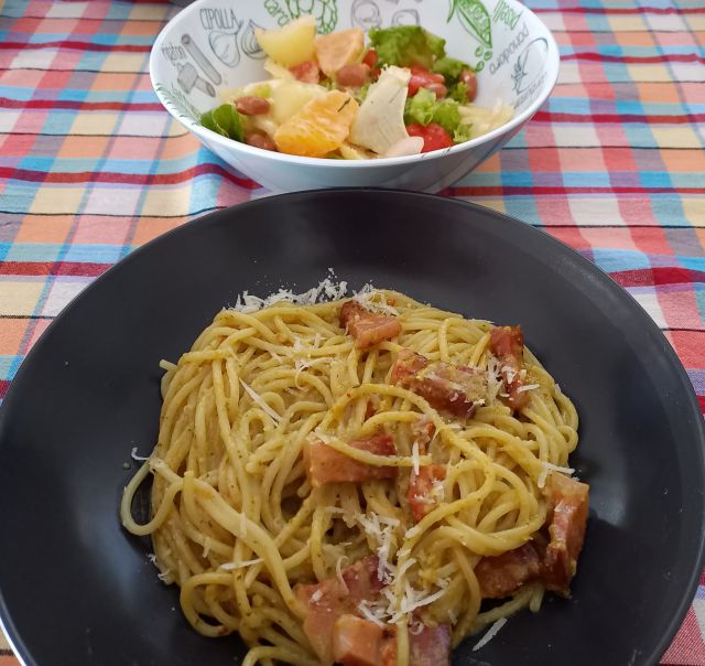 Špageti v omaki - slanina, česen, pesto genoveze; mešana solata