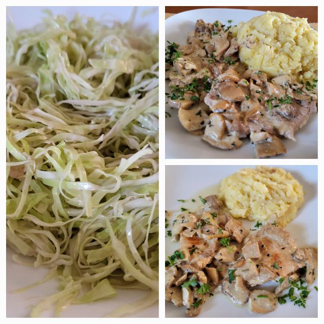 V petek svinjski in puranji zrezek z jurčki in cigančki, pražen krompir, zeljna solata