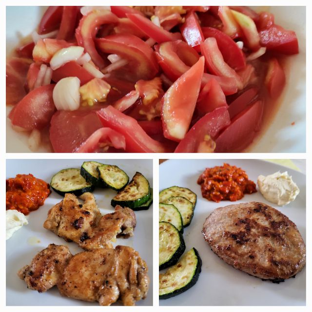 V soboto sva bila sama - pleskavica, piščančje bedro, kajmak, ajvar, popečene bučke, paradižnikova solata, lepinje