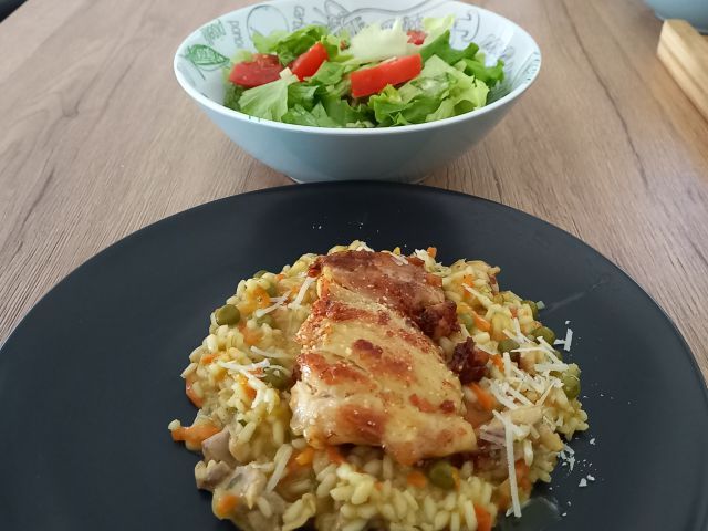 Rižoto in pečeno piščančje; zelena solata s paradižnikom in papriko