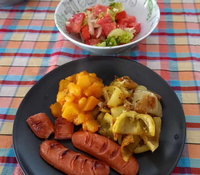Dušen krompir, pečena paprika z veliko česna klobase; zelena solata s paradižnikom in feta sirom