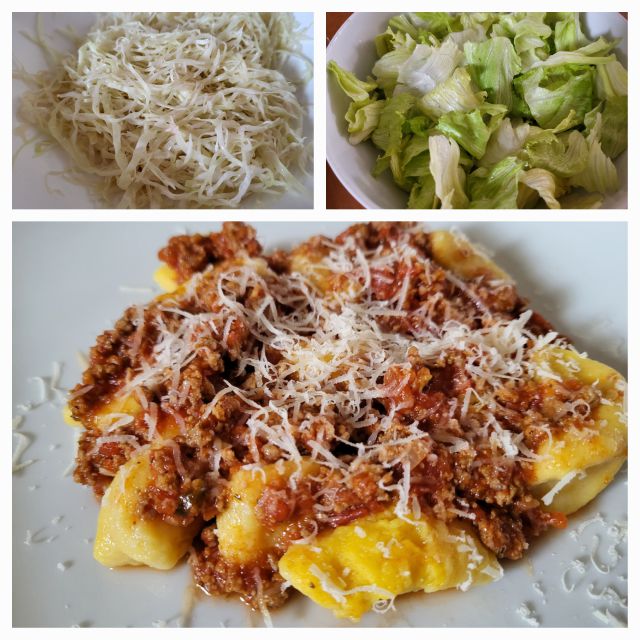 Včeraj bučni ( domača hokaido buča) njoki s skuto in bolognese omako, solata