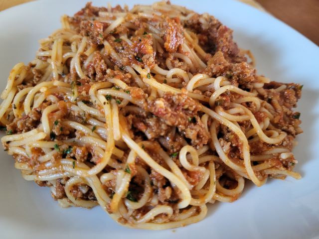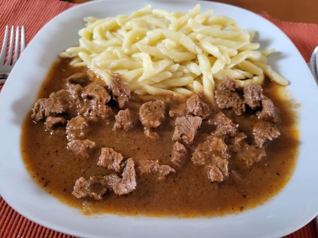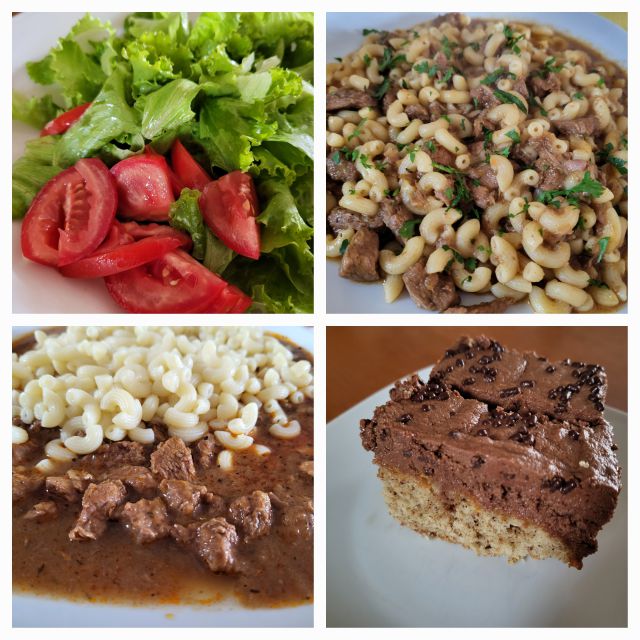 Danes telečji golaž, makarončki, domača zelena solata in paradižnik, sladica zamorec v gatah