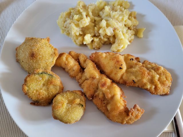 25.8 sva spet kuhala s sinom - panirano meso, bučke, pražen krompir, stročji fižol v solati