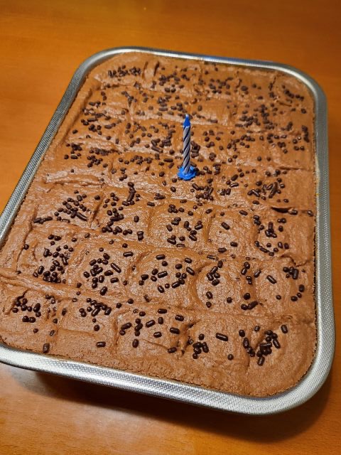 Včeraj lazanja in mešana solata. Ker je včeraj praznoval moj mož rojstni dan sva mu s sinom za presenečenje pripravila sladico- Zamorec v gatah. Pred ohoho leti mu je bila zelo všeč in tudi tokrat.