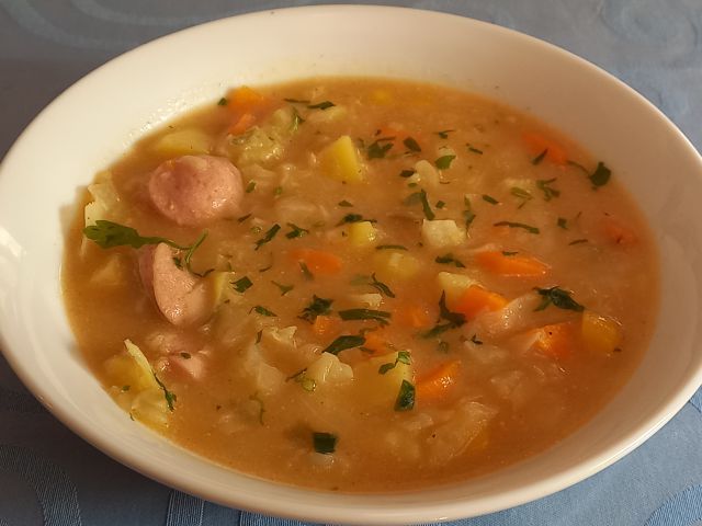 Zeljnata enolončnica s hrenovko; slivovi cmoki