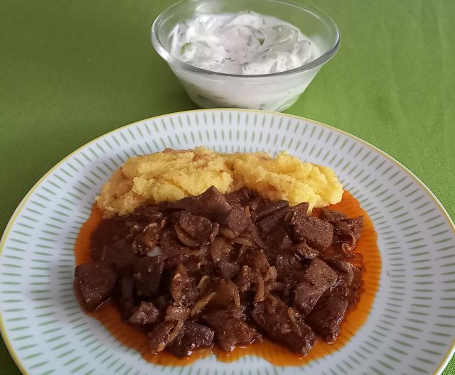 Pražena jetrca, polenta; kumarice z jogurtom in česnom
