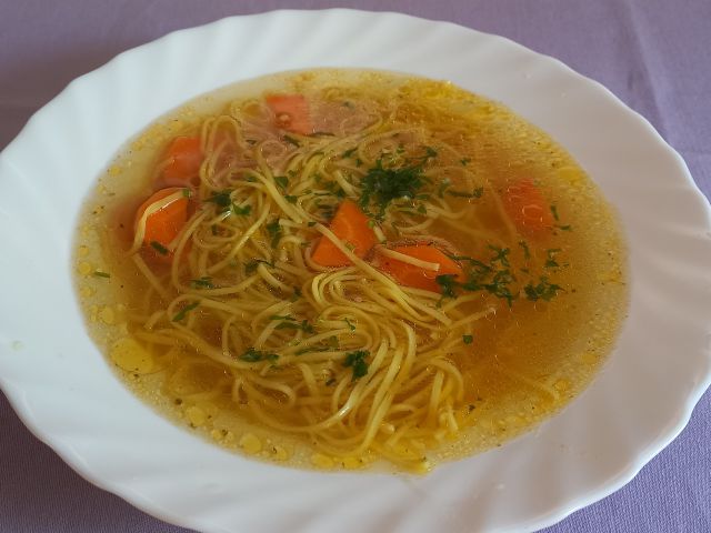 Goveja juhica z domačimi rezanci; pražen krompir, popečena govedina, hrenov zos; mešana solata