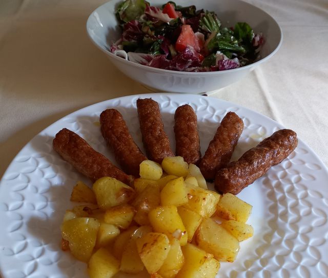 Čevapčiči, pečen krompir; mešana solata; pečena jabolka, prelita z vanili pudingom