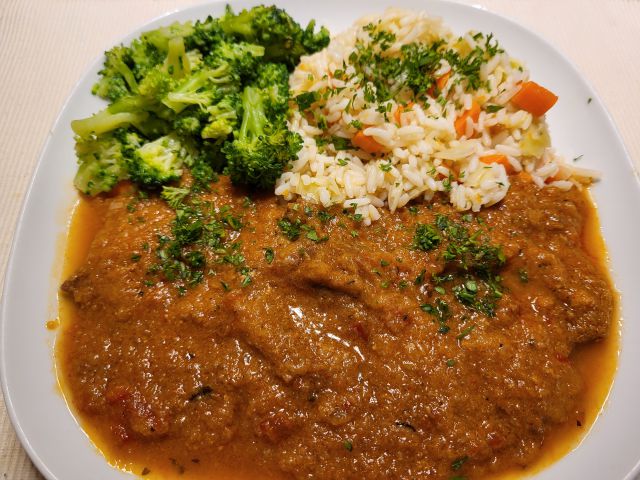 13.11 goveji zrezki v omaki, zelenjavni riž, brokoli, solata