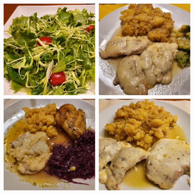 11.11. zrezki v omaki s sirom, pražen krompir, rdeče zelje, solata