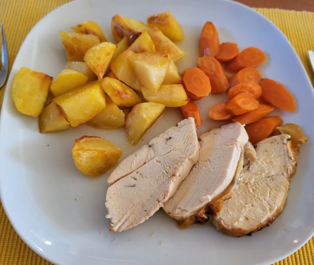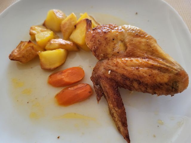 Sobota- goveja juha z zdrobovimi cmoki, pečen piščanec, pečen krompir, za moža sv.ribica v omaki zelenega popra, solata