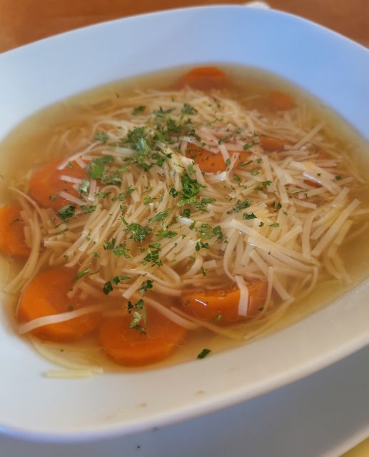 Danes goveja juha z rezanci, meso po pariško, pomfri, paradižnikova solata ( Lušt)
