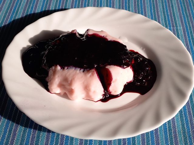 Piščančji eingemahtec; puding z borovničevim prelivom